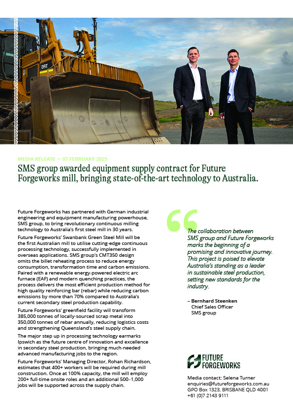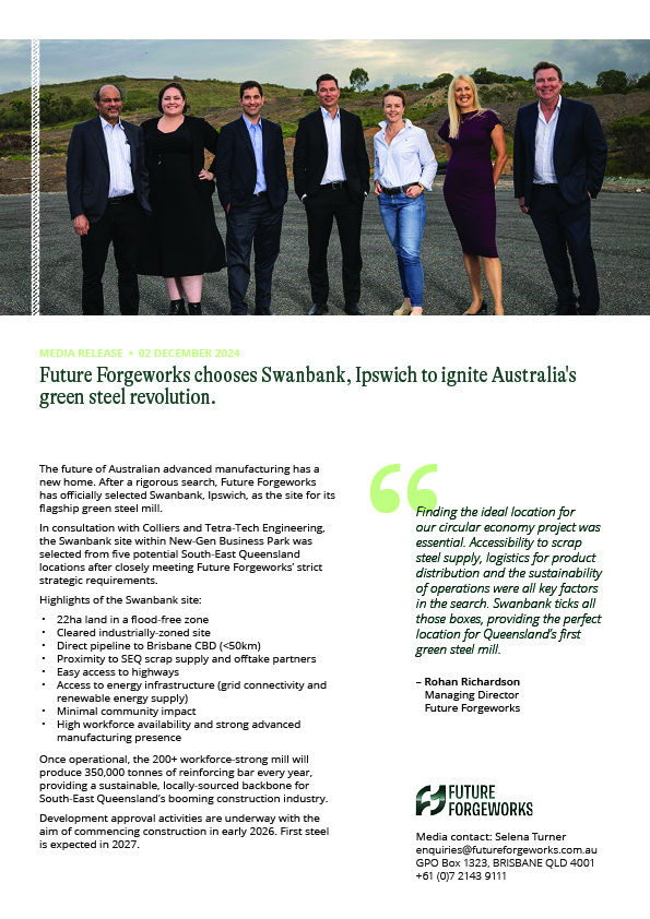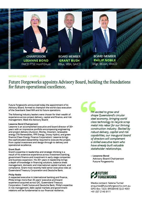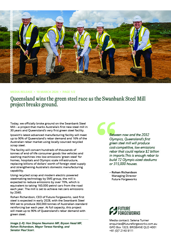 With an ambitious 2028 first steel goal, we hope to boost Queensland’s manufacturing sector in time for the Brisbane 2032 Olympic and Paralympic Games infrastructure delivery.