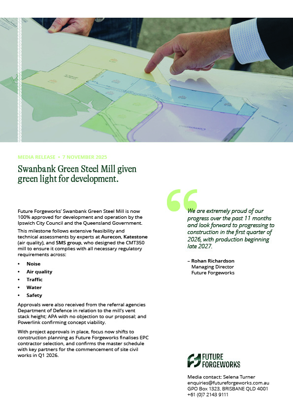 Feasibility studies and technical assessments have been completed and our steel mill project has received statutory approvals through the Ipswich City Council and the Queensland Government.